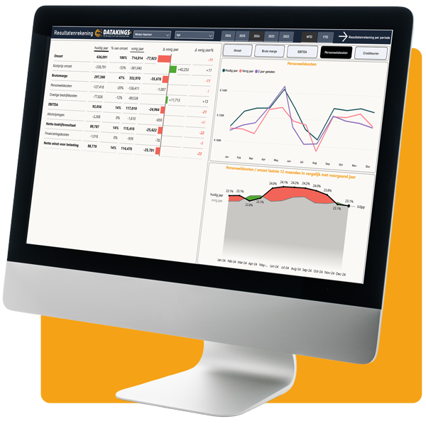 Met Datakings koppel je al je databronnen in één helder dashboard. Je krijgt realtime inzicht, voorkomt dubbel werk en werkt met betrouwbare cijfers. Eindelijk grip op je processen, zonder nieuwe software te hoeven aanschaffen.